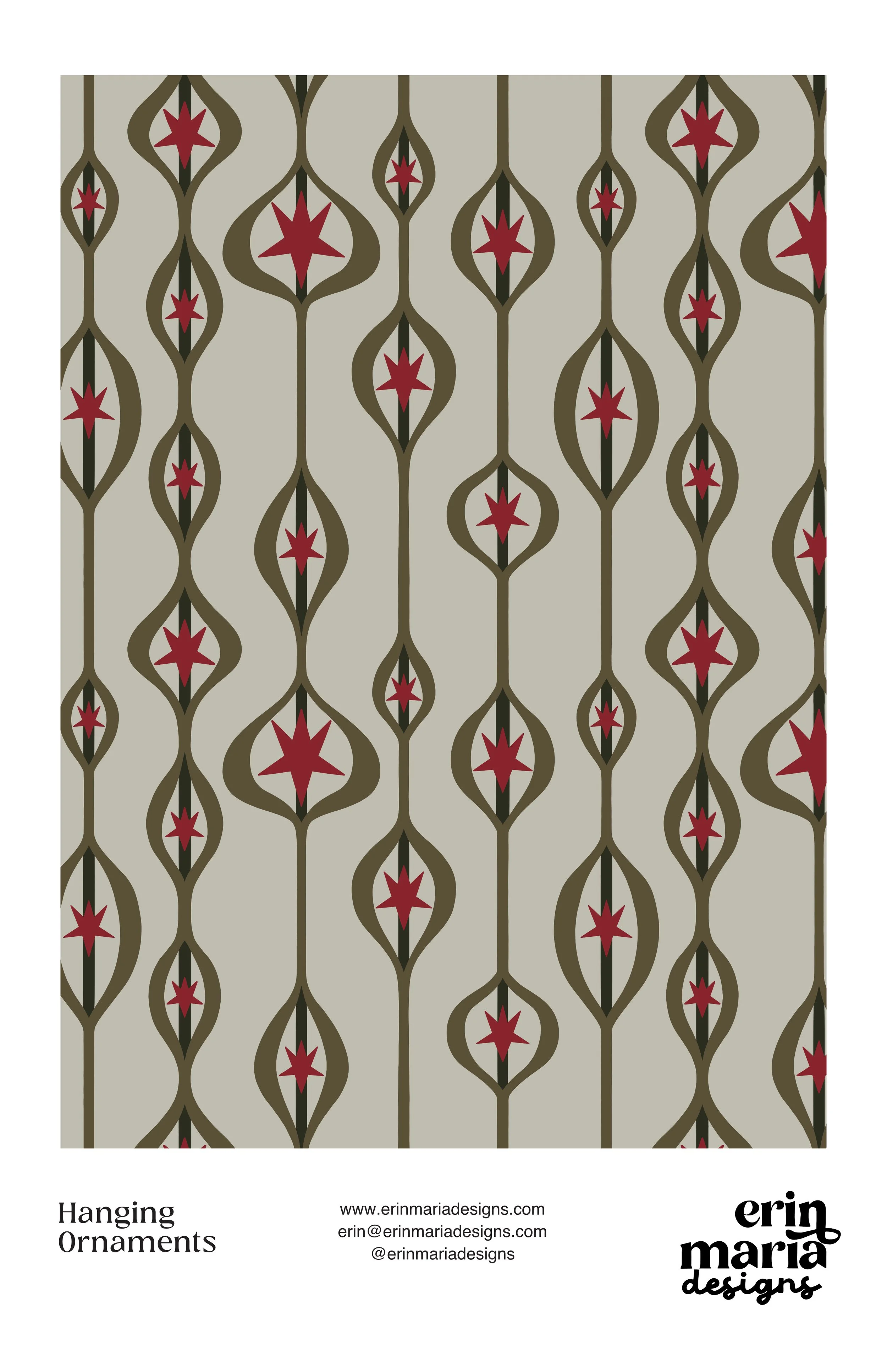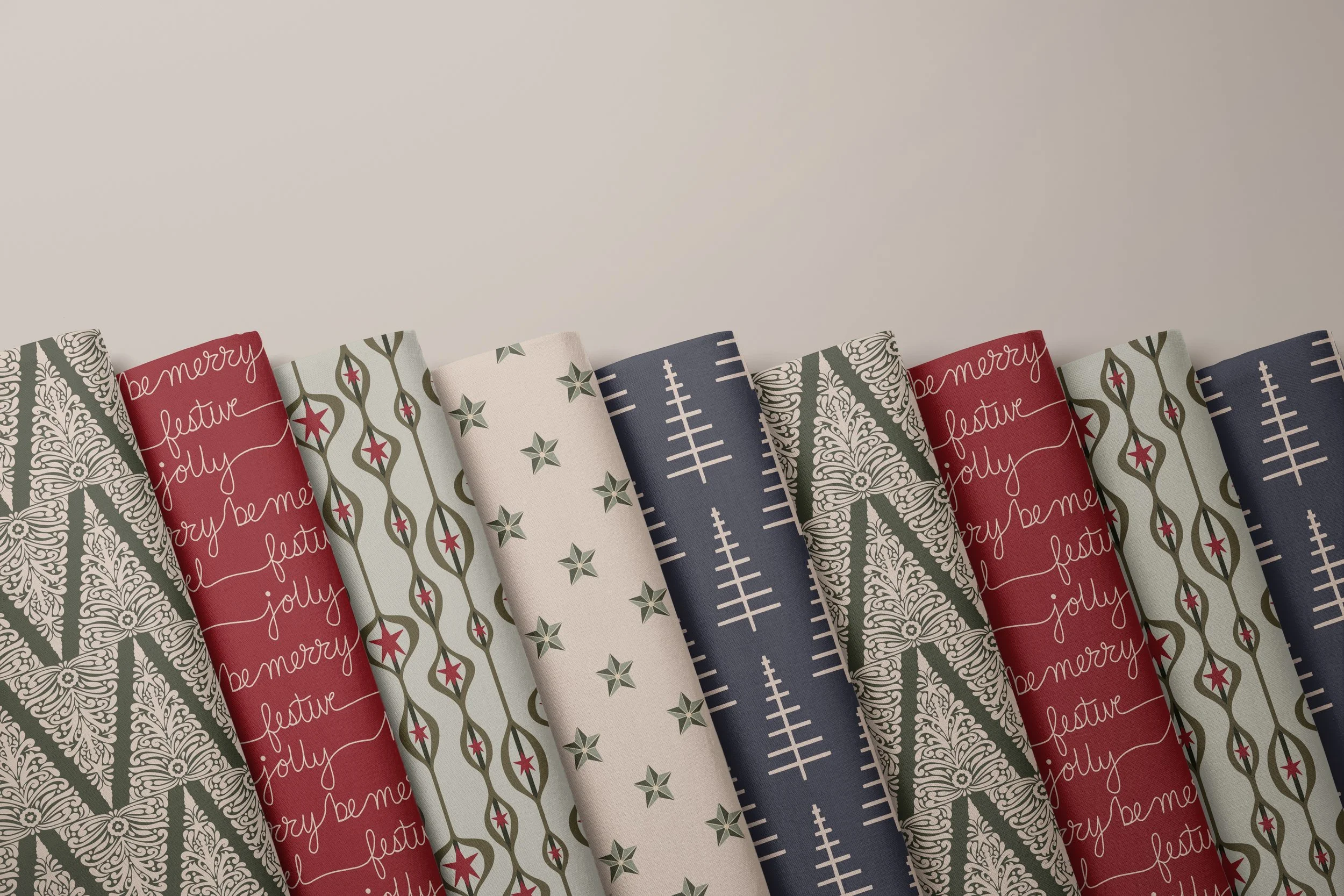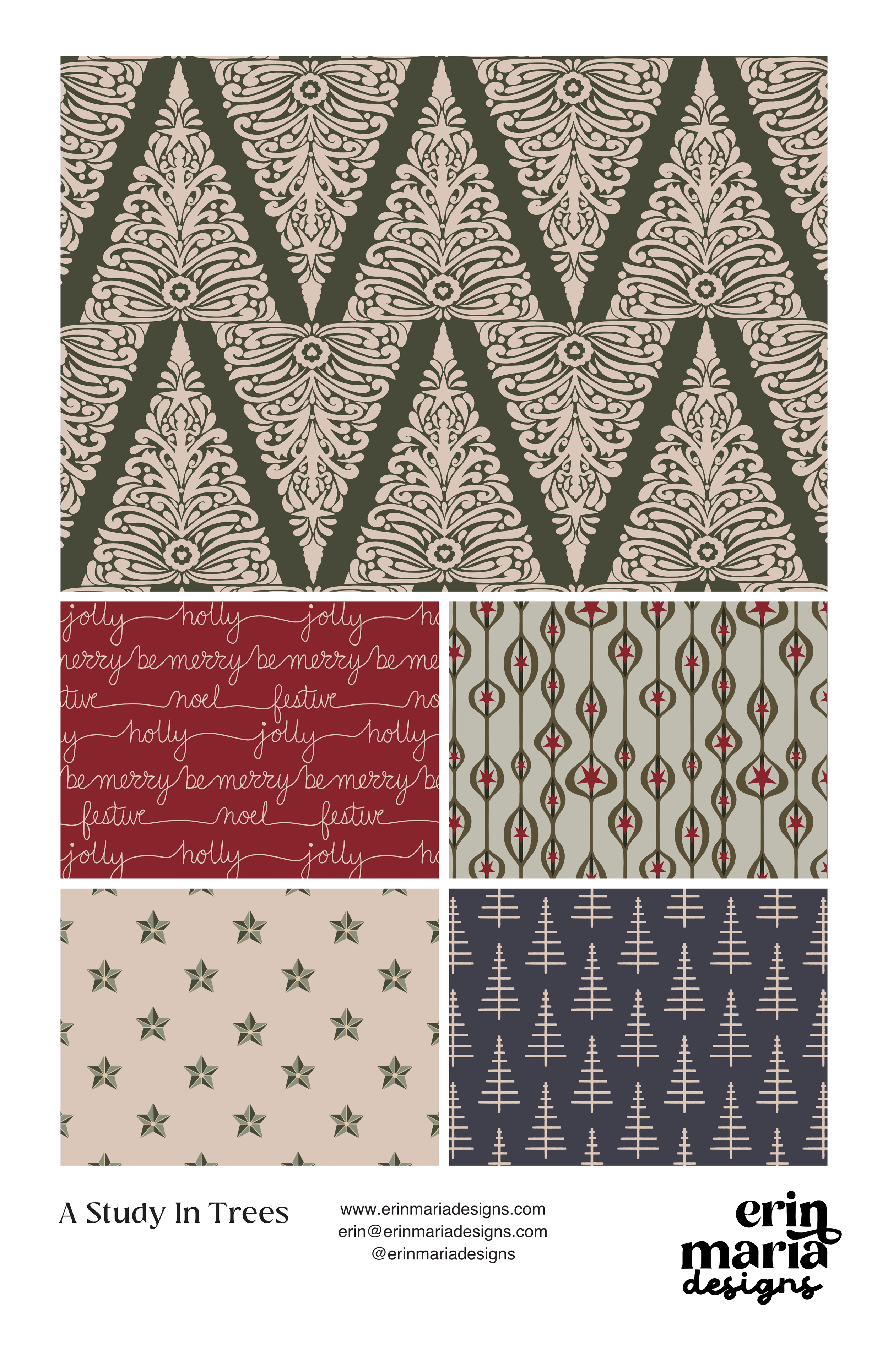 This festive mini-collection celebrates the beauty and spirit of Christmas through five unique patterns. From delicate filigree tree lines to whimsical holiday script, shining star motifs, and dangling ornaments, each design captures a different facet of the season. The set is completed with a modern, minimal take on the classic Christmas tree—perfect for adding a touch of timeless holiday charm to fabric, wallpaper, or home décor projects.