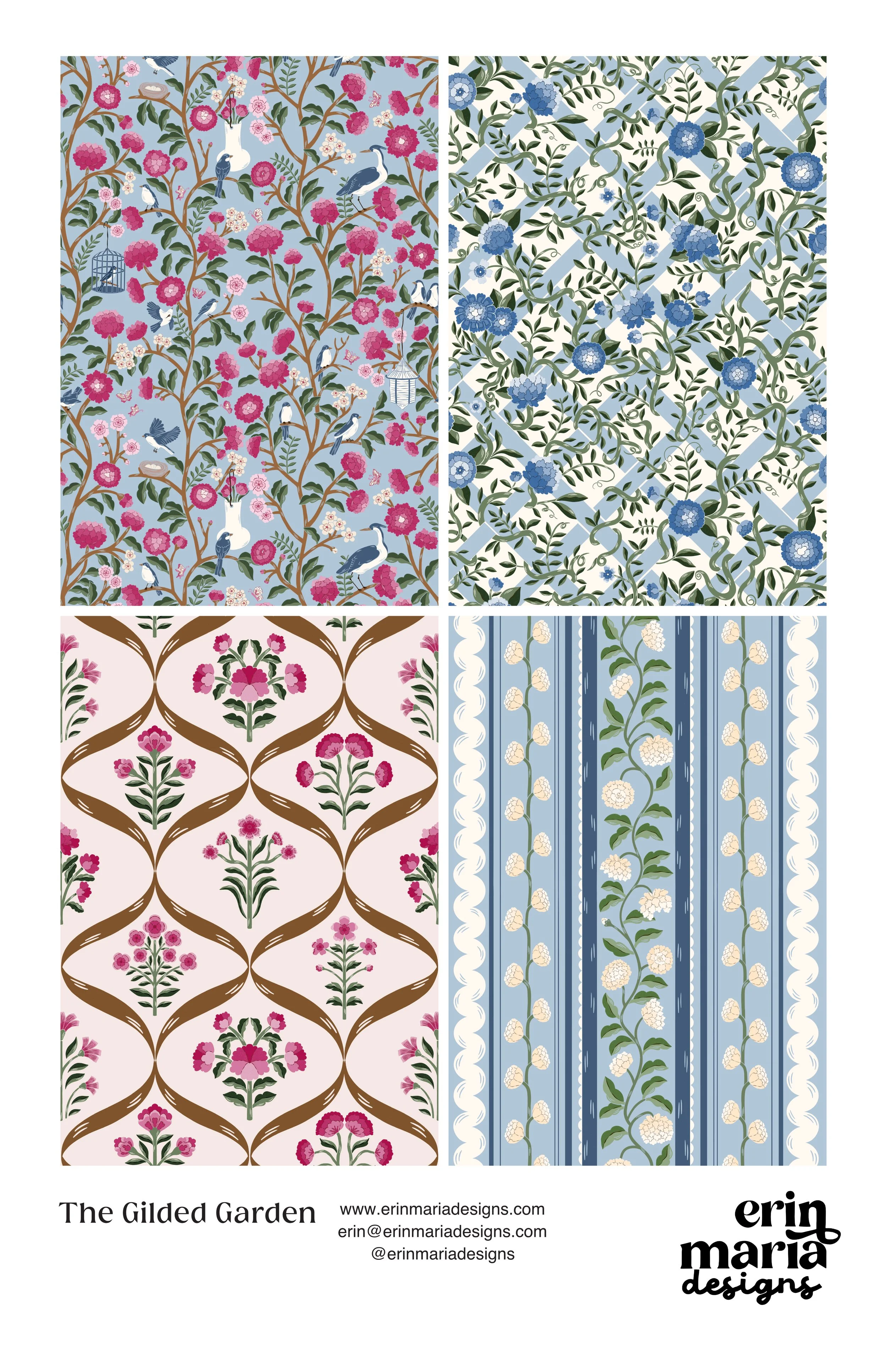 Gilded Garden is a modern chinoiserie wallpaper collection inspired by ornate gardens, flowing florals, and timeless decorative traditions. The four patterns explore layered elegance. Together, the collection balances classic grandeur with a fresh, contemporary sensibility—designed to bring warmth, movement, and quiet luxury to interior spaces.